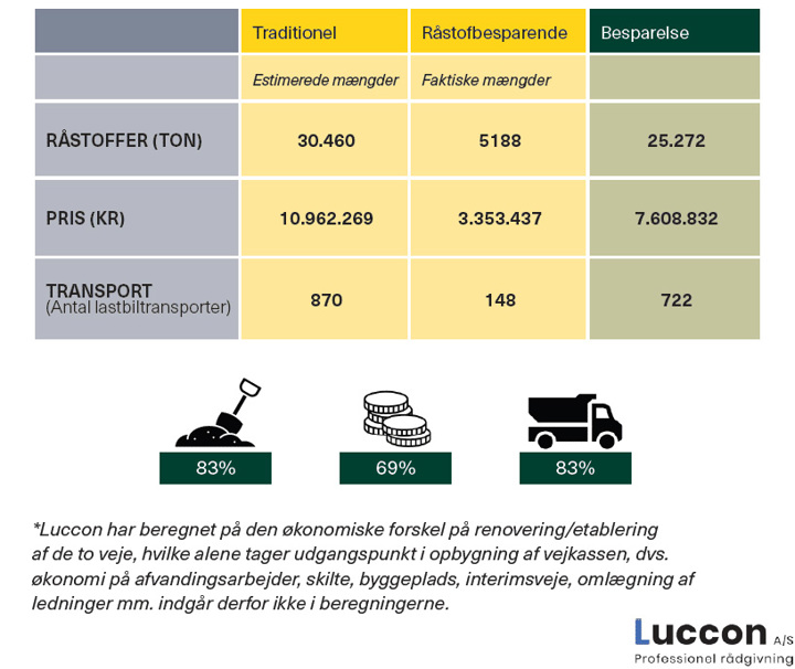 Projektet blev gennemført over fire uger med beboerkørsel tilladt, og der blev lagt vægt på tæt kommunikation mellem entreprenør, bygherre, beboere og rådgiver. Ved udvidelsen blev den eksisterende vejkasse, asfalt og grus genindbygget og stabiliseret, og beregninger viser, at den råstofbesparende løsning medførte markante reduktioner sammenlignet med traditionelle metoder: 83 procent besparelse på råstoffer, 69 procent lavere anlægsomkostninger og 83 procent mindre transport.